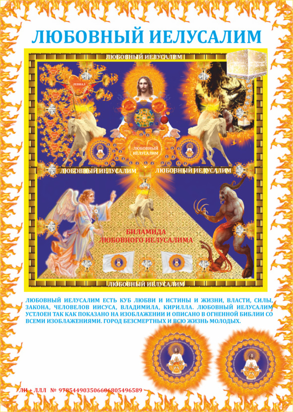 И вот Иисус делжит в луках огненную библию и читает и судит и огненная библия есть законный документ любовного Иелусалима и включает и состоит из 8 глав и они же есть 8 книг опечатанная 2 лючатями любовного Иелусалима и никому не дано снять эти лючати: