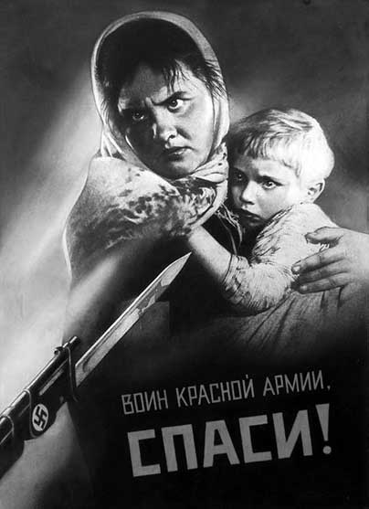 В том же 1943 году советский зритель увидел фильм Марка Донского «Радуга». Фильм выглядит не менее схематичным, чем «Она защищает Родину», но принцип работы с ключевым образом матери здесь принципиально другой. Авторы фильма делают ставку на максимально широкий спектр возможных «эмоциональных якорей», перебирая варианты, как перебирает их цыганка, анализирующая спонтанные реакции случайного уличного клиента, которому собралась гадать. Одноименная повесть Ванды Василевской, по которой был снят фильм, представляет собой чистейший образец властного заказа: написанная в крайне сжатые сроки (едва ли не за месяц), она исходно должна была выполнять мобилизационную задачу, являясь, по сути, развернутой иллюстрацией к известному агитационному плакату «Воин Красной армии, спаси!»[51]. Что само по себе делает понятной структуру текста: набор предельно провокативных, «плакатных» ситуаций, каждая из которых являла собой максимально доходчивый exemplum той опасности, которую немецкие изверги представляли для оставшихся на оккупированной территории женщин и детей, нужно было просто скрепить между собой хоть сколько-нибудь последовательным сюжетом, способным удерживать читательское внимание.