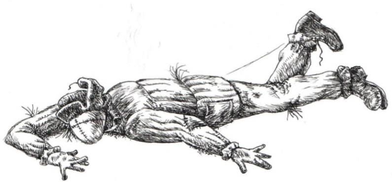 Чтоб нагнать страха, к пятке Василия привязали рыболовецкую леску, надломив рогулю, вставленную в штанину, в районе колена: теперь «убиенный» в предсмертных конвульсиях ещё и дрыгал ногой.