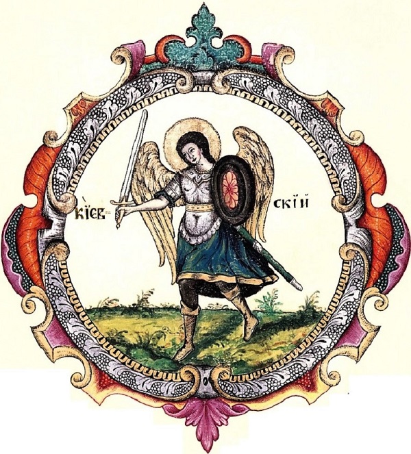 При этом должен заметить, что в XVII веке, когда рисовался Титулярник, архангел Михаил уже воспринимался как святой покровитель Киева. Во-многом это было результатом усилий главного, как бы сейчас сказали, «лоббиста» этого символа. Сделать ахистратига Михаила символом Киева мечтал выдающийся церковный деятель и историк Иннокентий Гизель, и эту идею он всячески проталкивал в своем «Синопсисе», быстро ставшим главным на Руси учебным пособием по истории.