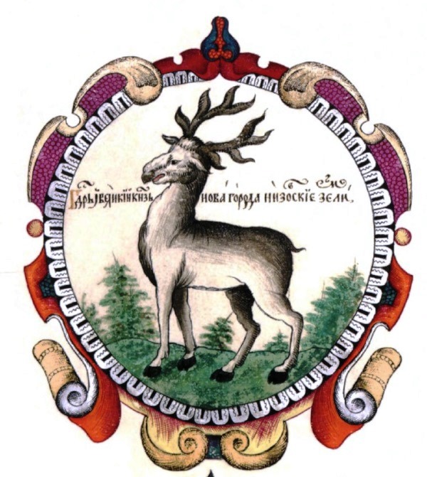 В Знаменном гербовнике Миниха 1728 года описание нижегородского полкового герба недвусмысленно: «Олень красный, рога и копыта черные, поле белое».