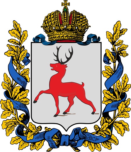 То же самое и с гербом Нижегородской губернии 1856 года: «В серебряном поле червленый идущий олень; рога о шести отростках, копыта черные. Щит увенчан Императорскою короною и окружен золотыми дубовыми листьями, соединенными Андреевскою лентою».