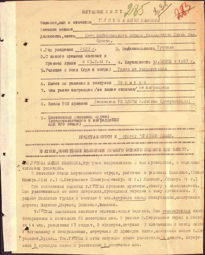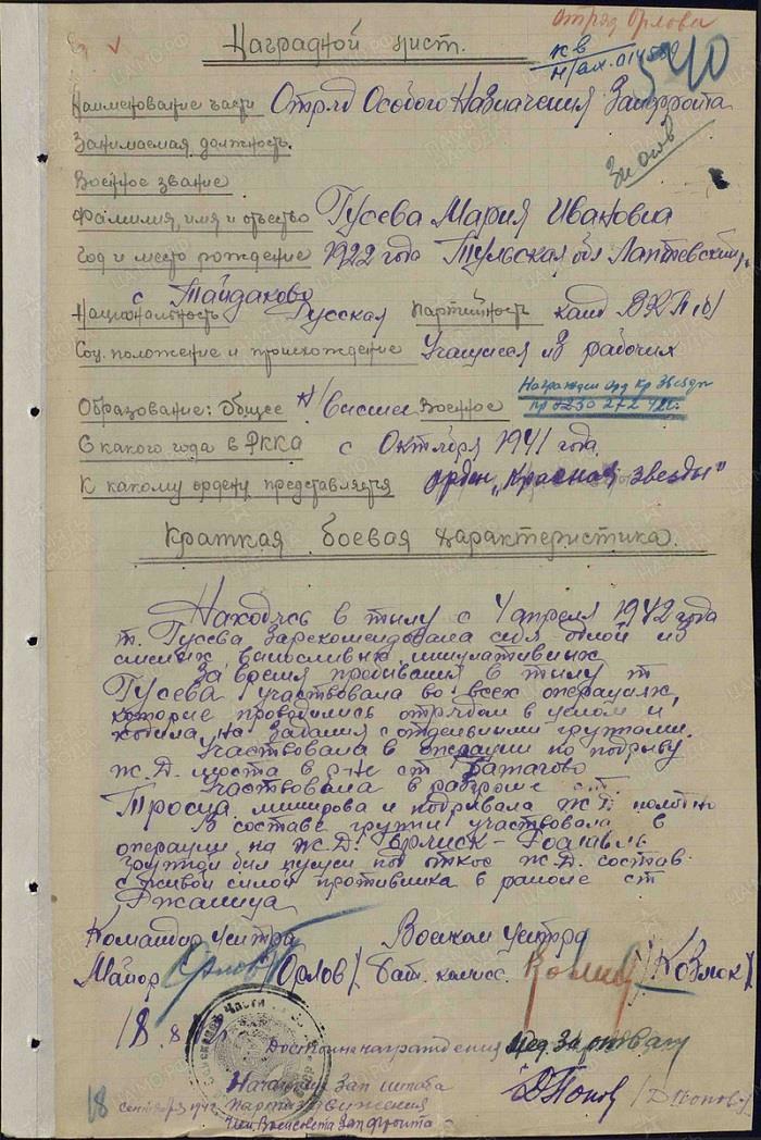 «Тов. Гусева Мария Ивановна три раза направлялась в тыл противника с задачами глубокой разведки.