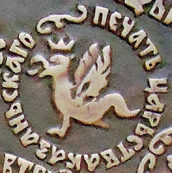 На ней гербы Казани и Астрахани поменяны местами – астраханским назван герб с казанским дракончиком. Вглядитесь – в центре уже знакомые нам новгородские медведи с троном, слева – астраханские корона и сабля, но сверху написано «печать казанская», справа – казанский Зилант, но надпись уверяет «печать астраханская».
