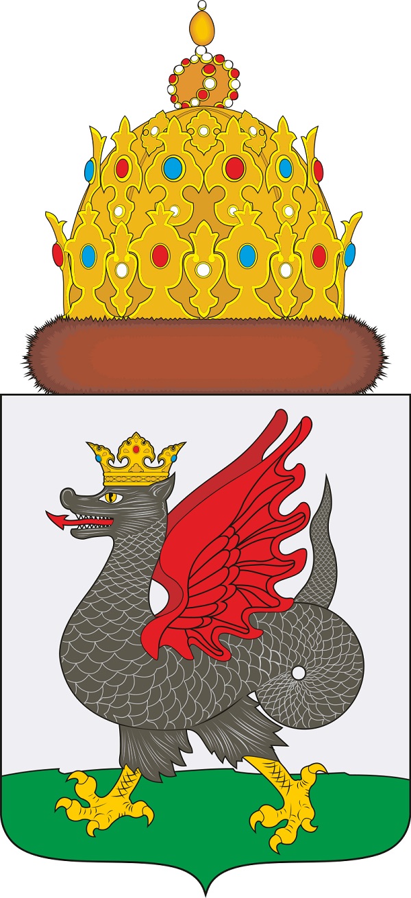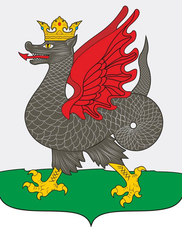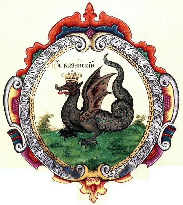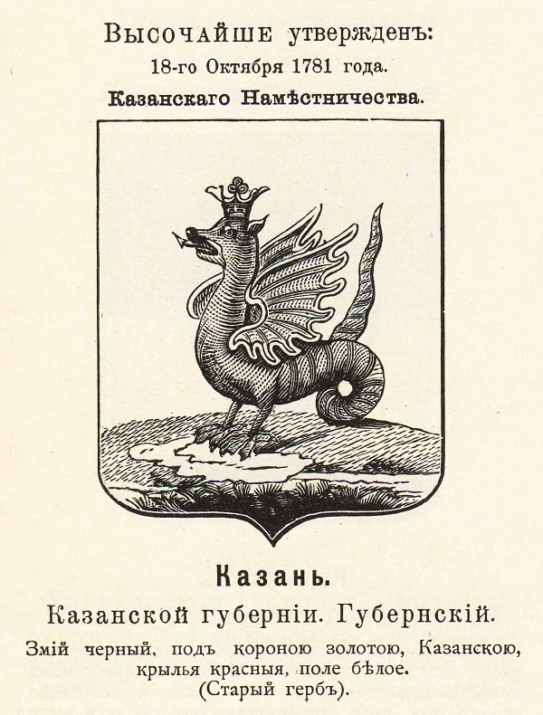 Не удивляйтесь, в геральдическом описании 1778 года все подробно объясняется: «… а в нижней части в серебряном поле черный с червлеными крыльями и увенчанный златым венцом дракон, представляющий герб Казанский, в напамятование, что сей град при Великом Князе Василии Иоанновиче был дан в удел Абдыл Летифу, снизверженному царю Казанскому».