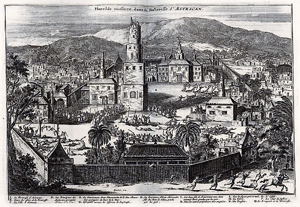 Гравюра XVII века из книги Яна Стрейса. Бесчинства казаков Степана Разина в захваченной Астрахани.