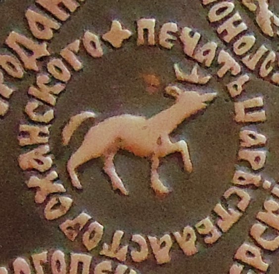 Как и в случае с Казанью, первый герб Астрахани придумал сам Иван Васильевич. Но если на «казанской печати» сразу и на века появился дракон Зилант, то коронованный волк, придуманный Грозным для Астрахани, не прижился. Единственное место, где он появился – давно знакомая нам Большая печать Ивана Грозного.