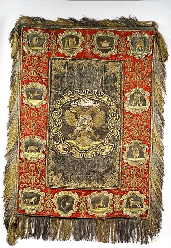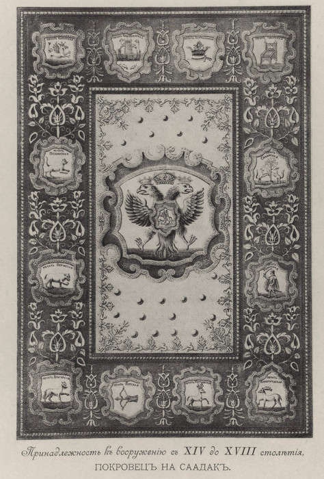 Сами понимаете, саадак, созданный для царя мастером Прокофием Андреевым, был роскошен. Саадачный покровец так вообще выполнял роль личного штандарта царя. И, самое для нас интересное – на покровце золотом были вышиты гербы 12 русских земель.