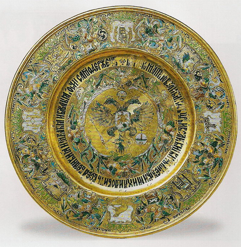 Любопытно что гербы двух первых царств – казанский и астраханский – периодически путали. Среди сохранившихся сокровищ русских царей есть знаменитая золотая тарелка царя Алексея Михайловича 1675 г. с печатями русских городов.