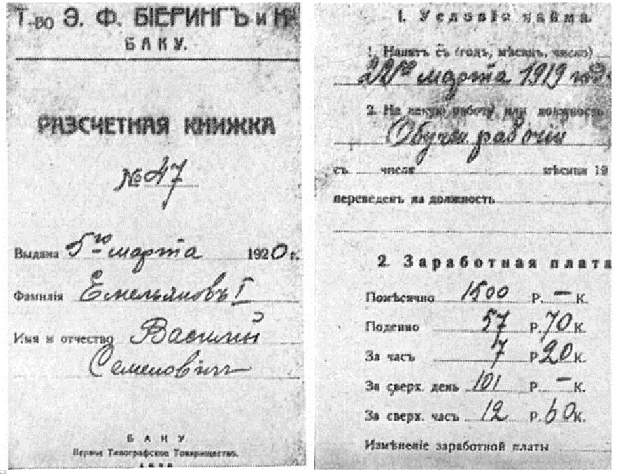 Расчетная книжка В. Емельянова на телефонной станции в Баку. 1920 г.