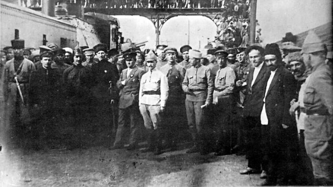 Киров (второй слева), Орджоникидзе (третий слева), Микоян (первый ряд, второй справа) среди красноармейцев и командиров 11-й армии на вокзале в Баку, май 1920 года