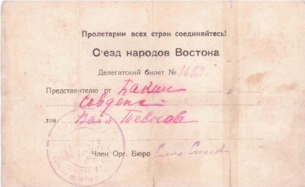 Делегатский билет N 1683 Вани Тевосова (Тевосяна И. Т.) на Съезд народов Востока 1920 г.