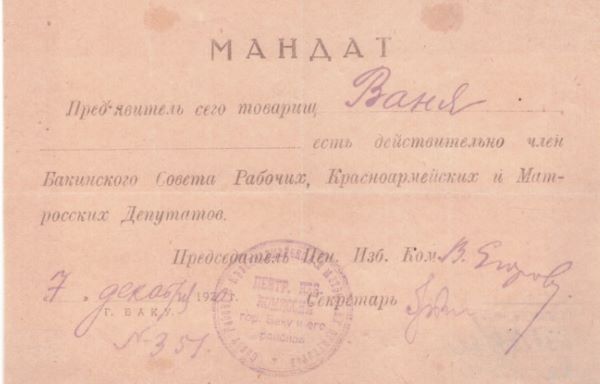 Мандат N 351 Вани (Тевосяна И. Т.), члена Бакинского Совета рабочих, красноармейских и матросских депутатов.