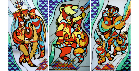 1982 – Витражи «Скоморохи» в ТЮЗе (цветное силикатное стекло), г. Свердловск. Общая площадь 22 м2.