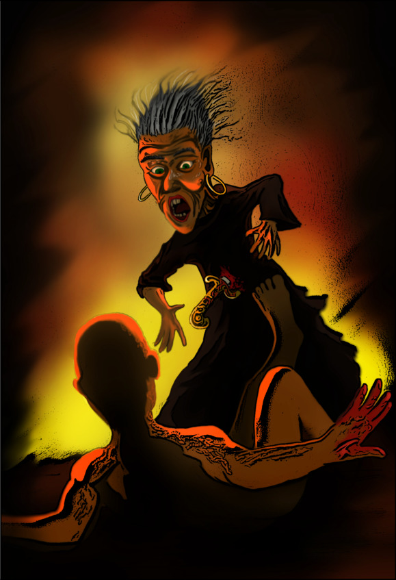 Through the slightly open eyelashes, Vladimir saw an approaching old woman with a dagger. Having collected all his will in the first Vova at the last moment intercepted her dagger with his hands, at the same time spilling the contents of his mouth in her face. The witch was confused by the surprise, which Vladimir took advantage of and intercepted the dagger from her hands, stuck in her stomach. The witch leaned back, screaming in pain. Splashes of blood of the witch from a dagger got on Vladimir’s body and in several moments on an altar. The space around Volodya began to spin, started turning. Cotton after which he fainted was distributed.