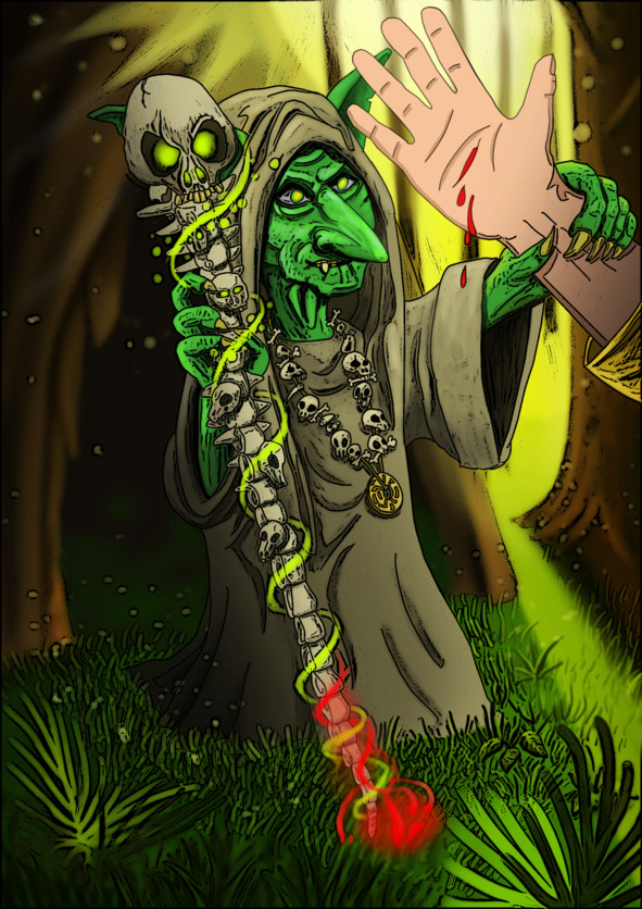– Kungkh drin vtykh – loudly said the goblin and touched the staff my forehead, empty eye-sockets of a staff sparkled a green flame and right there went out.