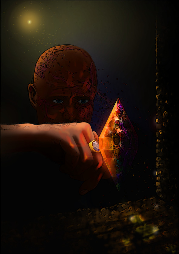 When a square piece of wall at chest level drove deep and sideways, it appeared to hang in the air, a slow rotating, dull glowing crystal in projection as a rhomb, only with many faces that reflected the light from the light very beautifully.