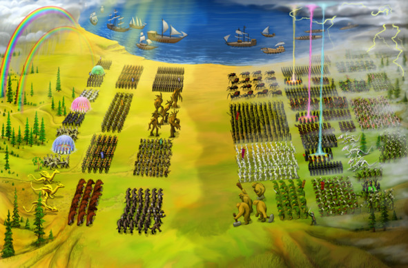 Kingdoms of people, light elves, centaurs, fairies and gnomes are on the western continent washed by three oceans. On east continent dark elves, trolls, goblins, a pangolin of snakes, orks, necromancers and cultist (servants of demons) live. In the north there are dragon islands, which are from far away the habitation of dragons. And the Southern Mainland, divided by a chain of mountains into two parts, is inhabited in the northern part by skeletons, dead, foxes and other uncontrolled births of death. In the southern part of the Southern Mainland there are so-called damned lands inhabited by the fruits of experiments of crazy magicians, storing artifacts and knowledge for which ordinary mortals are ready to pay mountains of gold. Many adventurers are missing in damned lands, so dangerous. Only the most powerful magicians, not blinded by the thirst for knowledge and riches, returned with tiny of knowledge and artifacts extracted from these lands.