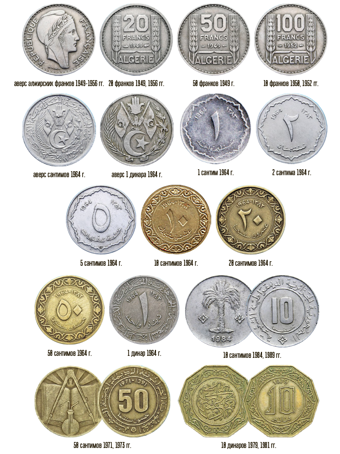 10 апреля 1964 года вместо франка введён алжирский динар в соотношении 1:1. На аверсе монет 1964 года изображена эмблема, которая в 1971-1976 гг. будет официально считаться гербом Алжира. Почему она появилась на монетах за 7 лет до этого, остаётся загадкой.