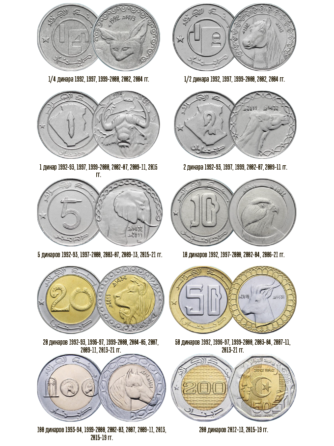 В декабре 1991 года в Алжире началась гражданская война, и уже в январе 1992 года сместили с поста президента, правившего страной 13 лет. С этого момента можно сказать о переходе Алжира к капиталистической экономике. Был введён новый ряд монет: 1/4 динара – Фенек (маленькая лисица), 1/2 динара – Берберийская Лошадь, 1 динар – Буйвол, 2 динара – Верблюд, 5 динаров – Слон, 10 динаров – Берберийский сокол, 20 динаров – Берберийский лев (вымер в дикой природе), 50 динаров – Газель, 100 динаров – Арабский скакун. Несмотря на то, что животный мир в Алжире беден, так как в значительной степени истреблён человеком, все монеты посвящены животным.