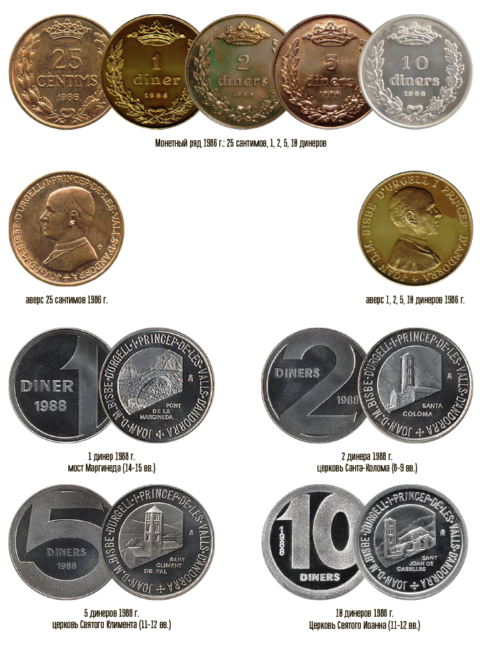 В наборе монет 1988 года изображены в основном старинные церкви Андорры: 2 динера – церковь Санта-Колома (8-9 вв.), 5 динеров – церковь Святого Климента (11-12 вв.), 10 динеров – Церковь Святого Иоанна (11-12 вв.). И только на 1 динере – мост Маргинеда (14-15 вв.).