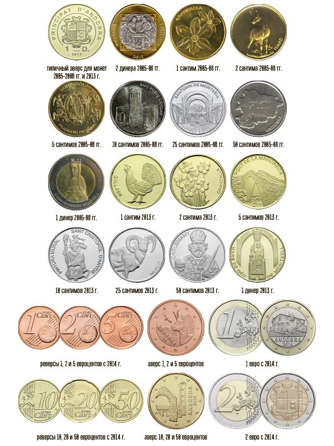 Единственный выпуск монет, который можно было бы назвать регулярным, был в 2005-08 гг. На 1 сантиме изображены нарциссы (национальный цветок Андорры), 2 сантима – пиренейская серна, 5 сантимов – видимо, часть фрески в церкви Санта-Колома, 10 сантимов – замок Sant Vicenc d’Enclar (9-12 вв.) в деревне Санта-Колома, 25 сантимов – часовня Богоматери Меричельской, 50 сантимов – карта Андорры, 1 динер – статуя Богоматери Меричельской, 2 динера – подписание в 1278 году т.н. Акта-Пареаж между графом Фуа и епископом Уржельским, разделявший между ними власть.