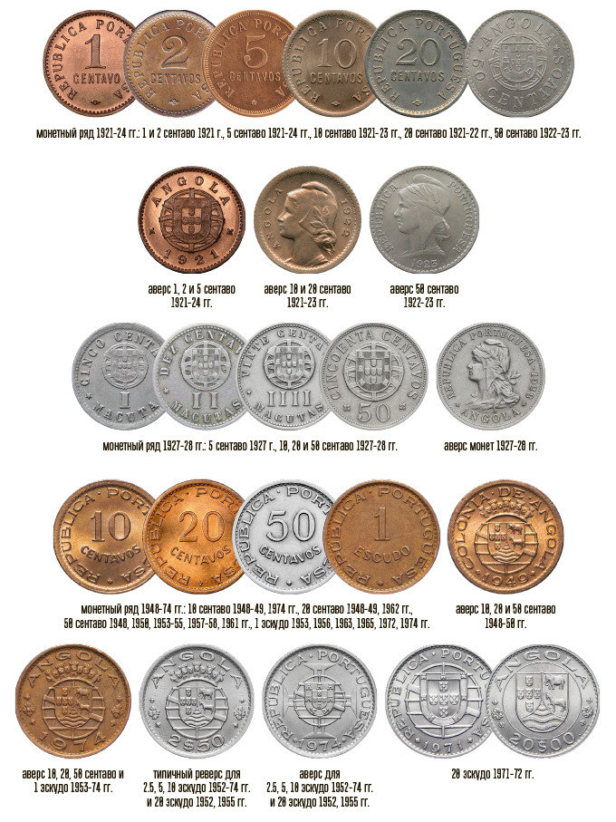 После Второй мировой войны в Анголу потекло большое количество эмигрантов, и, видимо, из-за нехватки монет в 1948-50 гг. чеканят новые 10, 20 и 50 сентаво. Примечательно, что на их аверсе впервые появляется герб Анголы, принятый в 1935 году, и написано «colonia de Angola», ведь статус «заморской провинции» Ангола получит в 1951 году.