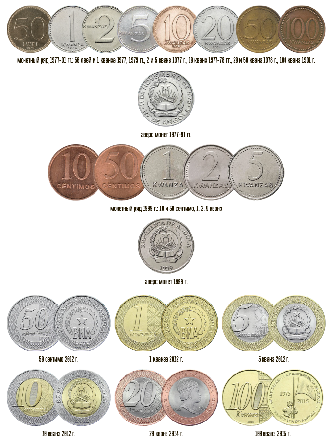 С 2012 года выпущены монеты нового образца. На аверсах 50 сентимо и 1 кванзы изображена эмблема национального банка Анголы (BNA), на 5 и 10 кванзах – герб Анголы, на 20 кванзах – Зинга Мбанди Нгола. В 2015 году, в честь 40-летия независимости Анголы, появились памятные монеты в 50 и 100 кванз. Интересный факт, что монеты и банкноты Анголы 2012 года изготовлены АО «Гознак».