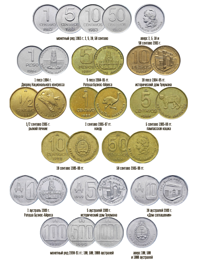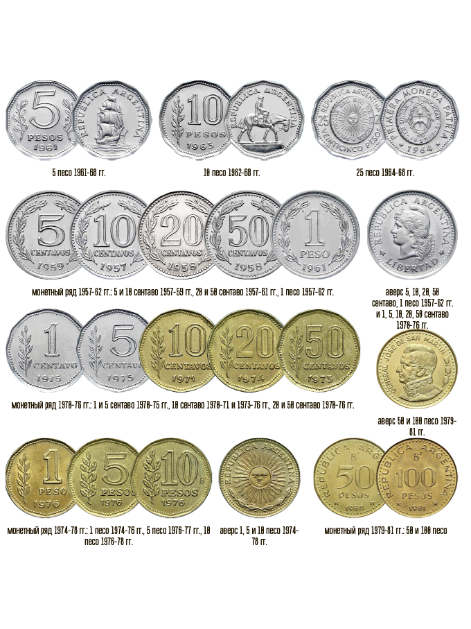 В 1957 году на аверсы монет 5, 10, 20, 50 сентаво и 1 песо вернулась женщина во фригийском колпаке как символ свободы. Гиперинфляция заставила чеканить сначала 12-угольные монеты в 5 песо с изображением фрегата «Президент Сармьенто», потом 10 песо с гаучо («ковбои», они приняли активное участие в войне за независимость) и 25 песо в память первой отечественной монете 1813 года.
