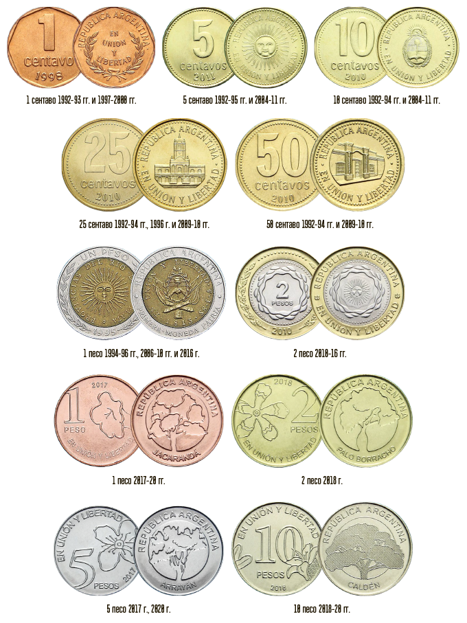 В 2001 году Аргентина объявила крупнейший в мировой истории дефолт (уже седьмой), а следующий случился уже через 13 лет. В 2017 году вновь изменился дизайн монет. На всех монетах теперь изображаются в основном южноамериканские деревья, возможно, как надежда на рост аргентинской экономики: Жакаранда (1 песо), Сейба великолепная, или хоризия, или «пьяное дерево» (2 песо), Лума остроконечная (5 песо), Прозопис (10 песо).