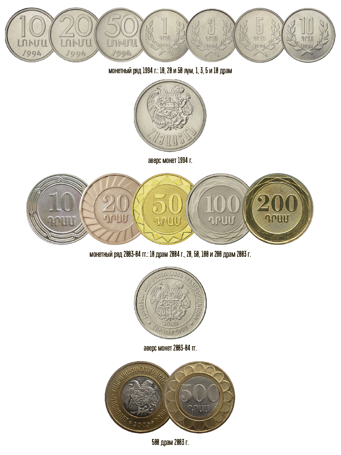 В 2003 году обновился дизайн монет, старые монеты (кроме 10 драмов) были выведены из обращения. Аверс остался примерно таким же, на реверсах вместо двух лавровых ветвей появились различные узоры. Кстати, армянские драмы являются платёжным средством и в НКР, несмотря на то, что у них есть собственная валюта – карабахский драм.