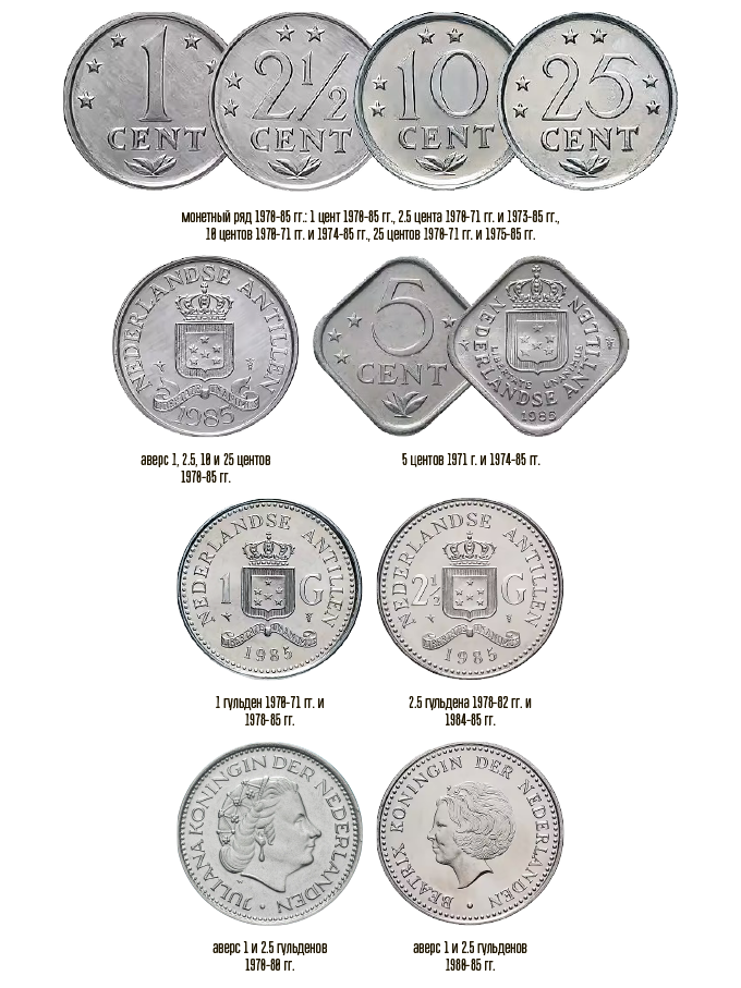 В 1954 году шесть островов (Аруба, Бонайре, Кюрасао, Синт-Мартен, Саба и Синт-Эстатиус) стали самоуправляемыми в рамках Нидерландских Антильских островов. Денежной единицей этих территорий был Нидерландский антильский гульден. Один гульден делится на 100 центов. Шесть звёзд на реверсах центов и гербе обозначают шесть островов. На аверсе гульденов изображён профиль королевы Нидерландов: до 1980 года это королева Юлиана, а после её отречения – королева Беатрикс.