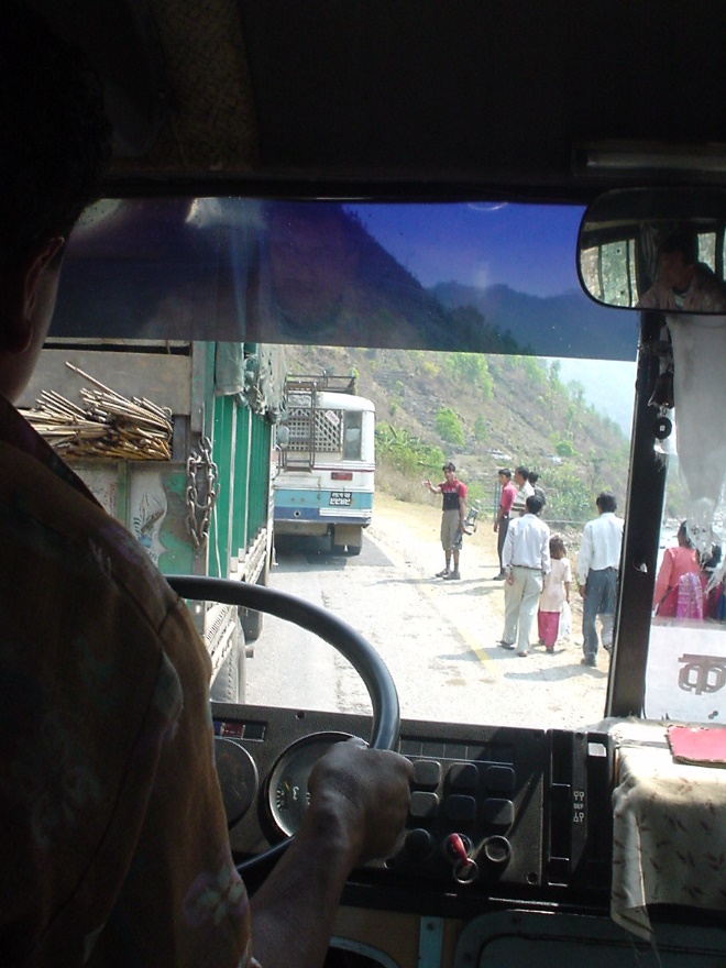 После часового препирания с командиром блокпоста и бесконечным совещанием еще с кем-то по мобильному, мы получили разрешение ехать дальше на свой страх и риск. При этом, в автобусе поднялся легкий ропот несмотря на то, что публика, по виду, собралась бывалая. Пополз слух, что накануне на улицах Катманду были убиты 2 итальянца, и что на дороге, по которой мы уже ехали, маоисты, до этого лояльно относившиеся к туристам, начали уже постреливать и грабить даже их. Обдумав такой вариант, я тут же запихал половину имеющихся денег в заранее приобретенный по случаю «ремень-тайник», решив, что лучше «перебдеть, чем недобдеть». Тут же всплыла перед глазами картина троекратного ограбления в один и тот же день гватемальскими партизанами в 1996-ом году. Вполне возможно, что те были «не настоящими» партизанами, так же, как и здесь могли попасться «неидейные» маоисты, вставшие на путь экспроприации, но легче от этого не стало – деньги отнимали не понарошку. Я окинул взглядом спутников по автобусу: на сидении рядом сурово восседал корейский скалолаз, в подходящем для этого костюме и очках. Позади него сидела его жена или подруга, неопределенного возраста в одноименном скалолазном прикиде. На самом первом сидении, рядом с водителем (руль почему-то находился слева, хотя автобус был корейский и движение в Непале левостороннее) сидел бывалого вида австриец лет 35-ти, довольно свободно изъяснявшийся с проводником на языке непали. На самом заднем сидении громоздился трехметровый голландец, у которого я занимал мелочь на рикшу, увешанный профессиональной фотоаппаратурой. Он полгода работал добровольным зубным врачом в каких-то богом забытых деревушках и после этой поездки собирался вылететь в Амстердам из Лхасы. Австриец же был учителем истории, в пути уже год, и в Непал попал из Индии, через Иран и Пакистан. По-видимому, по дороге он превысил свой бюджет и потом в течение 5 дней я ни разу не видел его рядом с едой. В соседнем ряду примостилась крохотная японка Канаэ с двумя огромными рюкзаками, с трудом понимающая 2 слова по-английски и, по-видимому, не отдающая себе отчет, куда она едет и где находится. Рядом с ней сидела симпатичная бельгийка Марике, проработавшая полгода в непальском госпитале медсестрой, лет 25-ти, но тоже бывалого вида. Позади нее сидел француз Жан, тоже в скалолазном костюме и бандане, лет 30-ти, вечно всем недовольный и раздражительный. Люксембуржец Марк, с прической а-ля парик Людовика XIV-ого, сурово высказывался о "зверствах китайских оккупантов" в Тибете. Ему вторила 45-ти летная немка из Мюнхена, с головой до предела забитый клише из антикитайской прессы. В автобусе была еще одна немка совершенно неопределенного возраста, с длинными сальными волосами, наведшая на меня мысль, что у нее, где-то припрятана фляжка со шнапсом (что потом подтвердилось). Она объездила полмира и не имела постоянного места жительства. Сперва она показалась мне неприятной особой, но впоследствии мы подружились. В заднем ряду слева сидели 2 африканца, по их словам, из Южной Африки, но, когда я попробовал заговорить с ними на африкаанс, они не поняли ни слова. На бэкпекеров они не были похожи (к тому же в жизни не видел африканских бэкпекеров), имели с собой чемоданы и мне показались больше похожими на нигерийских наркотрафикантов, чем на компьютерных инженеров, за котор