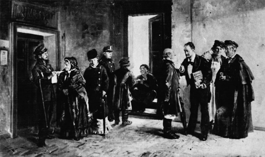 Маковский В.Е. В камере мирового судьи. 1880 г. х.м. ГРМ. Репродукция, открытое письмо