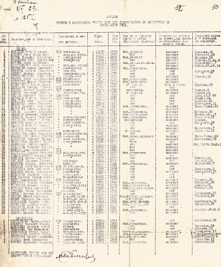 Список членов и кандидатов ячейки ВКП(б) Сибирского краевого союза кооператоров по состоянию на 10 апреля 1929 года. Под № 24 в списке – Косыгин Алексей Николаевич
