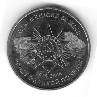На реверсе монеты в центральной части расположено изображение ордена Отечественной войны на фоне муаровой ленты. В верхнем секторе по окружности надпись «ҰЛЫ ЖЕҢІСКЕ 60 ЖЫЛ» на государственном языке, в нижнем – «60 ЛЕТ ВЕЛИКОЙ ПОБЕДЫ» на русском языке и числа «1945-2005» обозначающие год Победы в Великой Отечественной войне и год чеканки монеты. По окружности – выступающий кант.