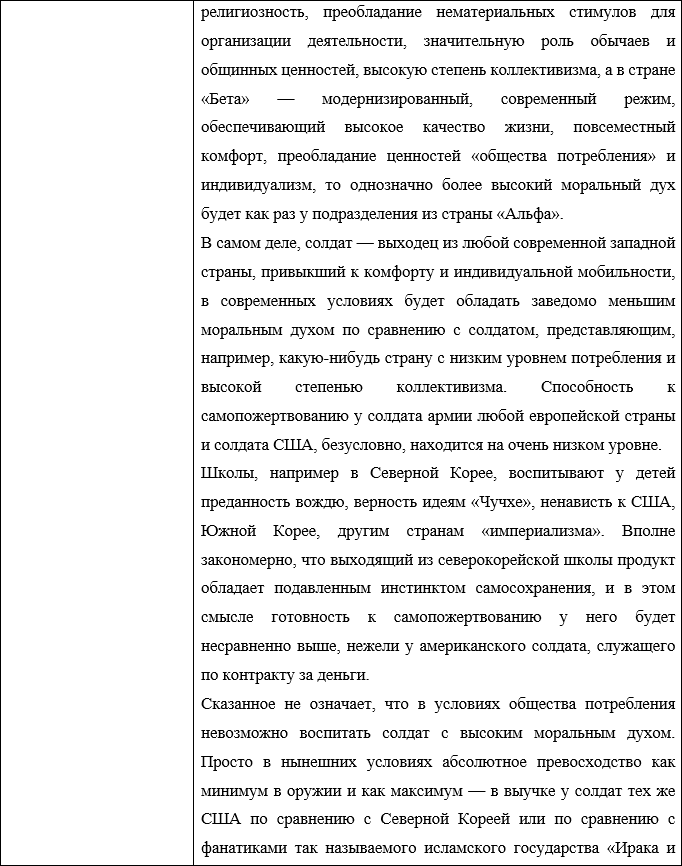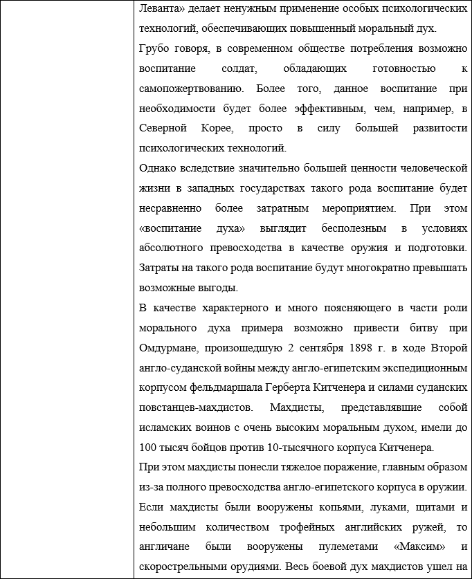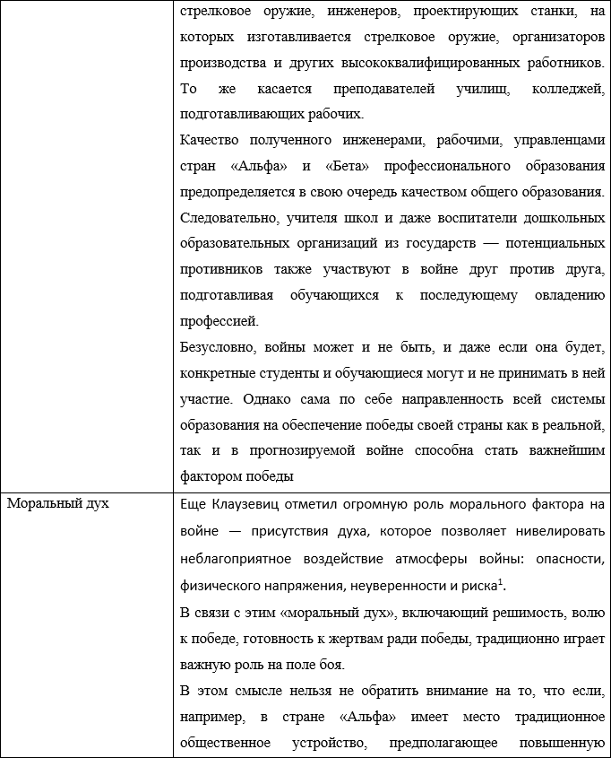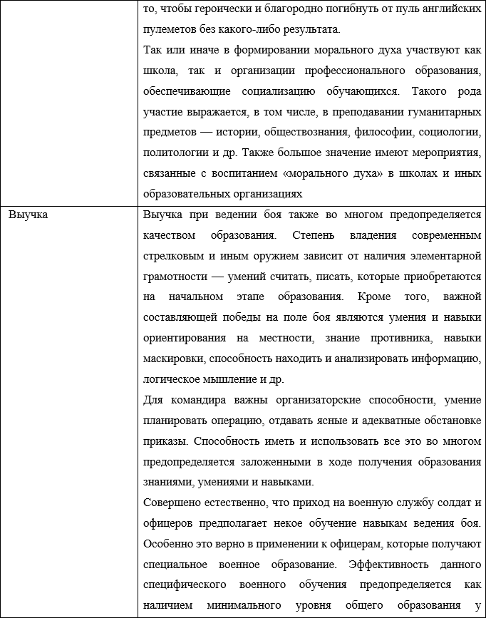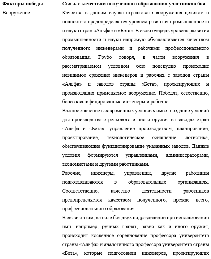 Согласно данному учебнику, на успех боя самым решительным образом влияют сами участвующие в нем войска, их моральный дух, выучка и вооружение. На основе данного тезиса сформулируем зависимость факторов, обеспечивающих победу в бою от системы образования в виде таблицы: