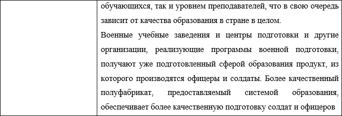 Таким образом, получается, что пока отсутствует горячая война, системы образования различных государств – потенциальных противников уже ведут незримую борьбу между собой, исход которой во многом может определять результаты горячей войны, если она произойдет. Более того, высокое качество работы системы образования того или иного государства во всех его сегментах может сподвигнуть потенциального агрессора на временный отказ от нападения из-за страха больших жертв при столкновении с подготовленными воинами.