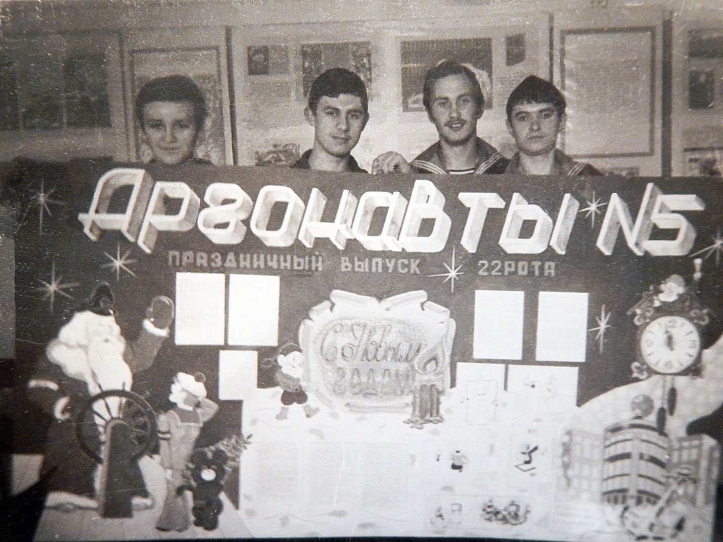 Среди нас было несколько великовозрастных, уже женатых, курсантов, успевших поработать по полученным ранее специальностям. Они сразу же устраивались на полставки на работу в Училище и кормили свои семьи, потому что на 9 рублей семью не прокормишь. Было много ребят с первыми взрослыми спортивными разрядами по борьбе, гребле, лёгкой атлетике, многоборью. Были кандидаты в мастера спорта по боксу и радиоспорту (причём второй из них учился в нашей группе и был чемпионом России среди юношей в личном зачёте). Всем нашлось применение для того, чтобы продолжать славные традиции Ленинградского Мореходного Училища ММФ СССР. Каждая рота к очередному празднику подготавливала стенную газету. Мне, как окончившему первый класс детской художественной школы, пришлось вспомнить все приобретённые ранее навыки художественного творчества и взяться за краски и карандаши. Вместе с другими ребятами мы рисовали стенгазету к Новому году на трёх больших, склеенных между собой листах ватмана. Остальные роты делали то же самое. В Училище проводился традиционный конкурс стенных газет, и в случае победы в нём победителей ожидало поощрение от руководства Училища. Наша газета отличалась от школьной стенгазеты тем, что здесь мы были полными хозяевами и сами решали, что рисовать и о чём писать. Полнейшее курсантское народное творчество! Да и на это время, пока мы делали газету, нас освобождали от всех остальных работ. «Лучше держать в руках тяжёлый карандаш, чём лёгкий ломик!» – гласит народная мудрость! После двух недель наших усилий появилось огромное художественное полотно с заголовком «Аргонавты». Название было хорошее, но очень длинное. На то, чтобы нарисовать столько букв, ушла неделя времени. За вторую неделю на полотне появилось изображение заснеженного Учебного корпуса, перед которым юный Новый год в морской форме докладывал стоящему за штурвалом, румяному Деду Морозу о заступлении на Праздничную вахту. Снежинки живописно окружали заметки о жизни роты, снегири украшали ёлки перед Училищем, и всё это сверкало и переливалось блёстками от разбитых ёлочных игрушек. Нам самим так понравилось, что мы сфотографировались вместе со своим «детищем». Перед Новым годом все роты вывесили свои газеты в Актовом зале, и курсанты на переменах ходили смотреть на творения ротных художников. Училищное жюри конкурса присудило Первое место газете нашей роты! Нам объявили благодарность от Начальника Училища, а командир своей властью разрешил мне на Новый год съездить домой в Калинин.