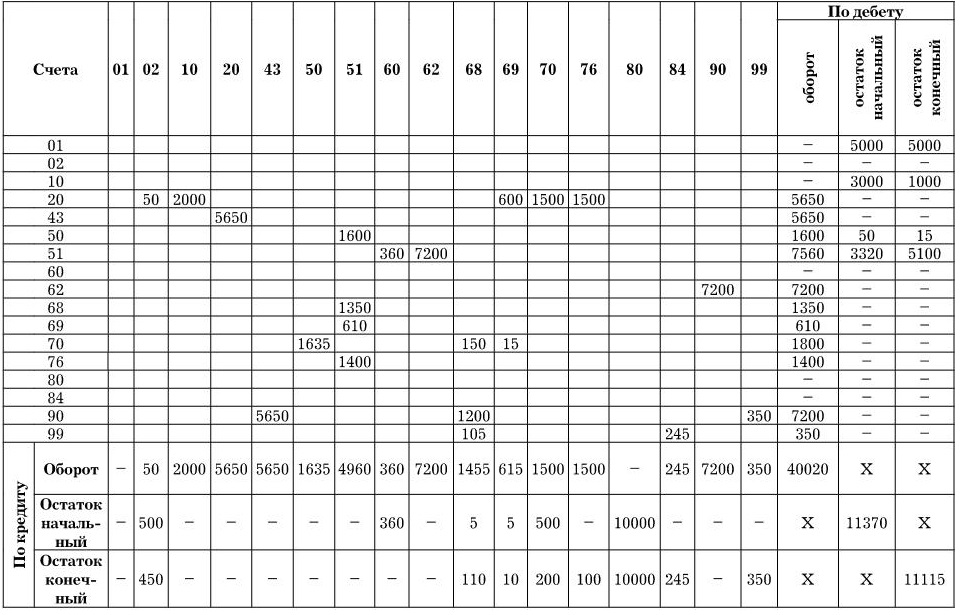 Шахматный баланс строится в виде квадратной матрицы. В ней по горизонтали и вертикали записываются номера счетов Главной книги предприятия. Затем из журнала регистрации хозяйственных операций в матрицу, в соответствии с корреспонденцией счетов, переносятся суммы, которые отражаются на пересечении соответствующих строк и столбцов. По строке собираются дебетовые обороты, а в столбце – кредитовые. Подсчитав итоги оборотов, определяют конечное сальдо: дебетовое записывают по строке, а кредитовое – по столбцу. В правом нижнем углу матрицы отражаются итоговые суммы оборотов и остатки, начальные и конечные.
