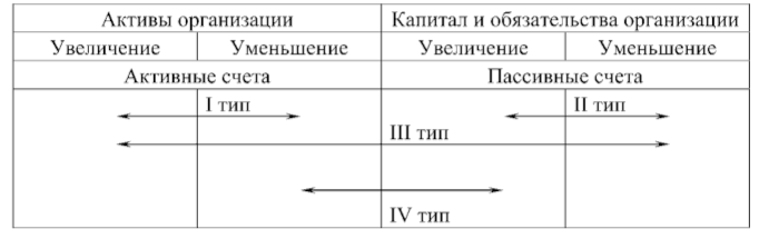 Следует отметить, что под влиянием фактов хозяйственной жизни бухгалтерский баланс подвергается изменению. В экономической литературе выделяют четыре типа изменения в балансе (рис. 1.6).