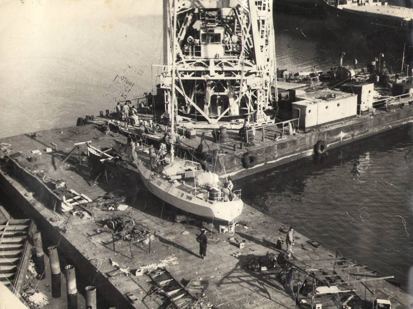 Подъем из воды и устранение течи отняло еще некоторое время. Наконец, яхта закачалась рядом с подъемным краном.
