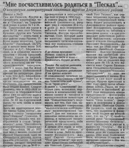 Первый вариант этих заметок, гораздо более короткий и несвободный от фактических неточностей, печатался в 1993 году в нескольких номерах газеты «Привет, Петербург».