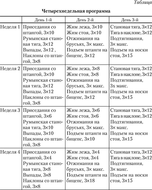 Программа фундаментального (базового) тренингаВашему вниманию предлагается четырехнедельная программа, основанная на шести базовых движениях и дополняющих их вспомогательных упражнениях (см. табл.). Цель программы – сделать вас сильнее и заложить фундамент дальнейшего прогресса на ближайшие несколько лет.
