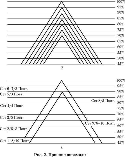 Пирамидальная структура тренировки является выдающимся научным открытием. «Силу нельзя развить околопредельным весом, – объясняет профессор Ю. Верхошанский, – Силе нужна мощная основа. Всмотритесь в пирамиду: чем шире основание, тем выше ее пик (рис. 2, а). То же в тренировке силы. Чем больше атлет „вкладывается“ в тренировку с непредельным весом, тем выше пик его силовых достижений».