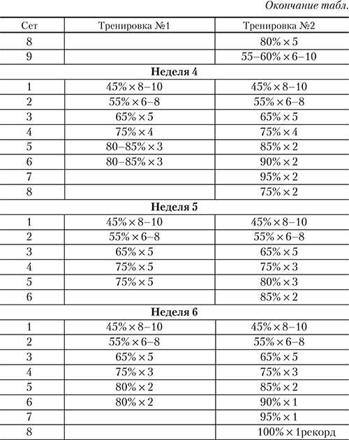 Полная схема упражнений в шестинедельном цикле с указанием нагрузки в процентах дана в таблице.