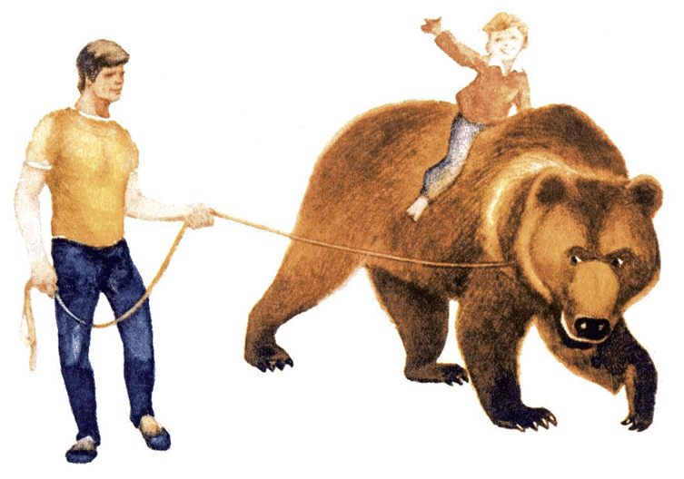Самым добродушным из всех зверей был большущий медведь Колька. Так мне, во всяком случае, казалось. Мы с ним очень подружились. Три года подряд он играл со мной, брал с ладони сахар, разрешал гладить густую мягкую шерсть. Иногда после репетиции брат сажал меня верхом на медвежью спину, и Колька, храпя и слегка переваливаясь с боку на бок, катал счастливого наездника вокруг манежа. Было весело и немного жутковато. Всё-таки медведь не скаковая лошадь!