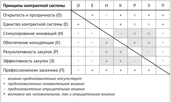 Необходимо отметить, что усилия, предпринимаемые в целях соблюдения каждого отдельно взятого принципа, далеко не всегда положительно отражаются на степени соблюдения других принципов. Например, стремление обеспечить более эффективное расходование бюджетных средств может привести к закупке как менее современных, так и менее качественных товаров, работ и услуг, что противоречит принципам результативности и стимулирования инноваций [71, 72, 73]. Закупка узкоспециализированной или инновационной продукции, наоборот, может привести к ограничению конкуренции, а также увеличению затрат как непосредственно на этапе закупки, так и на этапе последующей эксплуатации, технического обслуживания и ремонта [31, 74]. В обобщенном виде, вышеперечисленные и иные возможные эффекты приведены в Таблице №1.