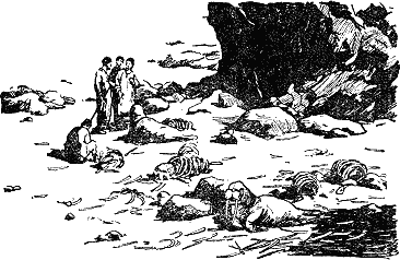 Тут открылось невиданное и неслыханное. В левом крыле моржового города, там, где крутые скалы высокой грядой ушли далеко в море, лежал высокий берег. Сюда в самые сильные бури не могла забежать волна. Между валунами были навалены кости, выбеленные ветром дочиста.