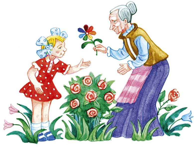 С этими словами старушка сорвала с грядки и подала девочке Жене очень красивый цветок вроде ромашки. У него было семь прозрачных лепестков, каждый другого цвета: жёлтый, красный, зелёный, синий, оранжевый, фиолетовый и голубой.
